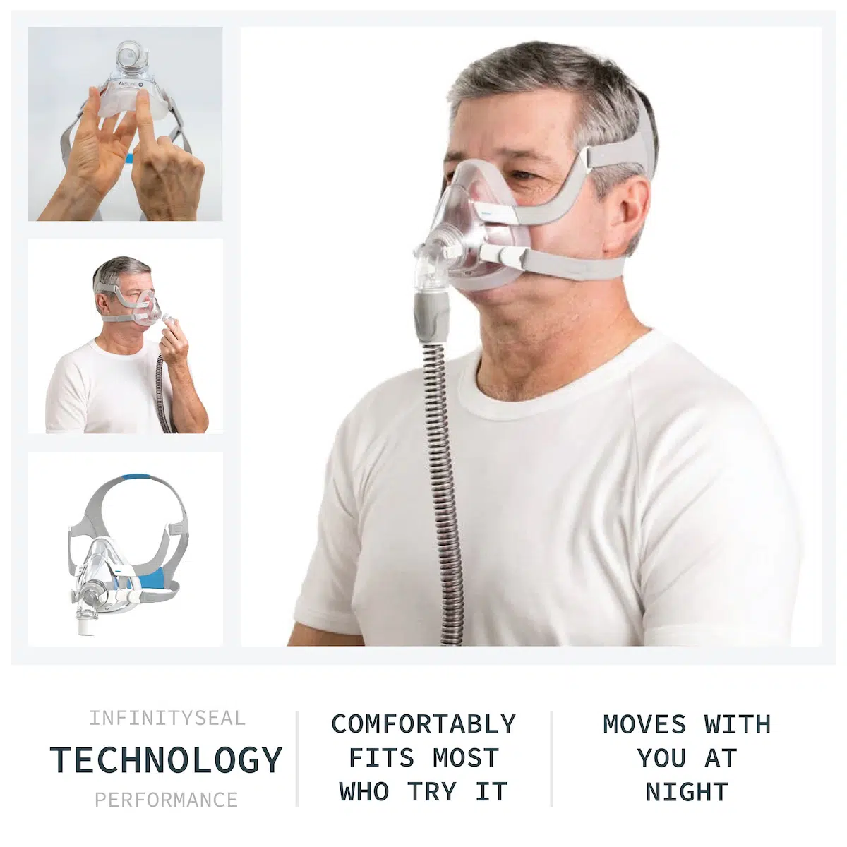The soft InfinitySeal cushion adapts to facial contours, reducing leaks and pressure marks.