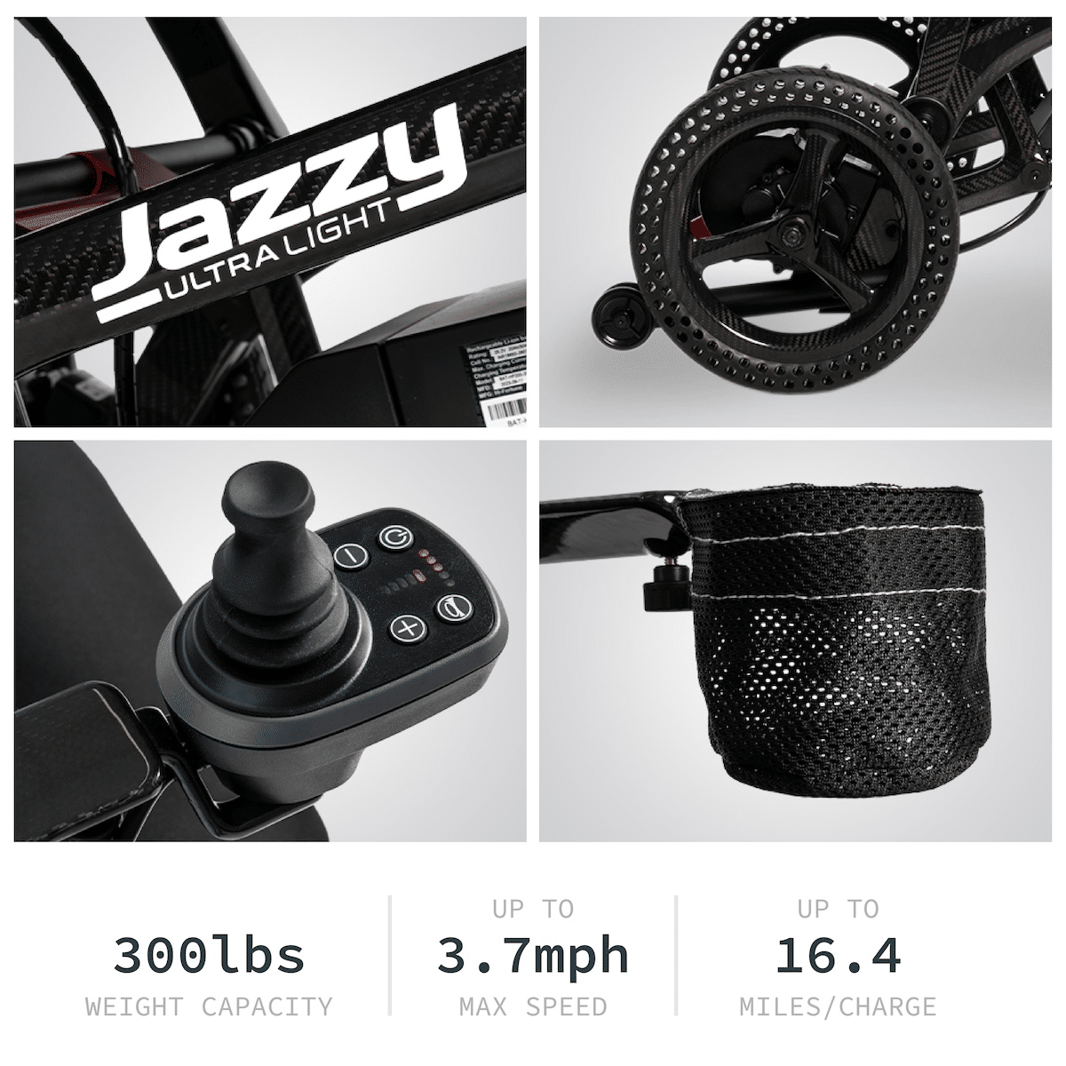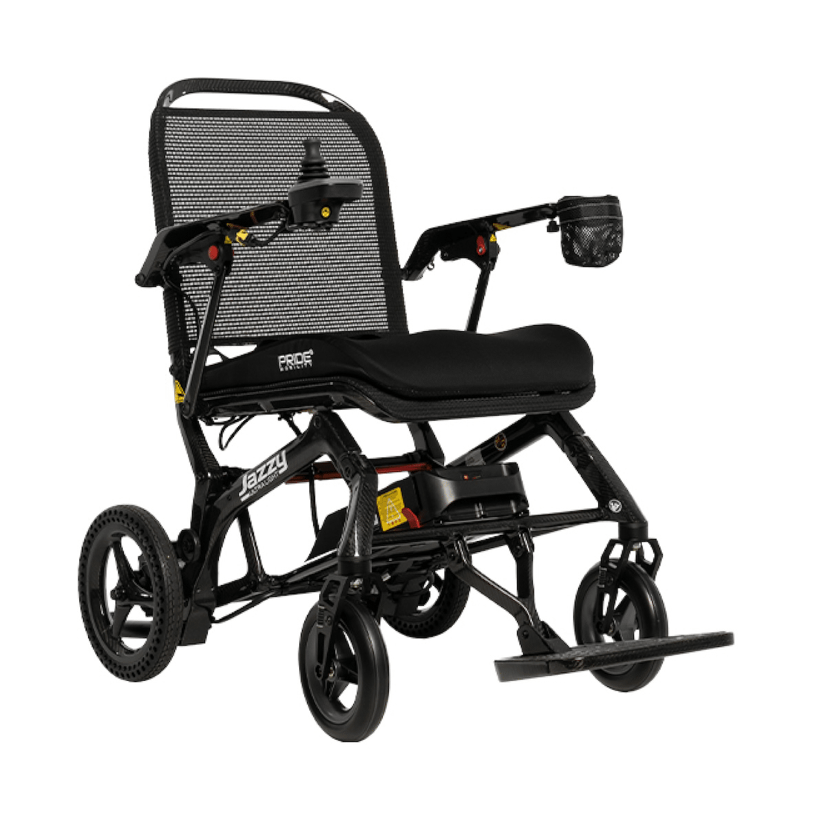 Request This ProductThe Jazzy® Ultra Light is Pride Mobility’s lightest power wheelchair yet, weighing just 33 lbs. without the battery. Built with an all-carbon fiber frame, it’s both durable and ultra-portable, folding nearly flat in seconds for convenient storage or travel. With airline-compliant lithium batteries, smooth front suspension, and comfortable seating, this chair is designed to keep up with your adventures — whether you’re navigating airport terminals, storing it in a car trunk, or cruising up to 14.7 miles on a single charge.