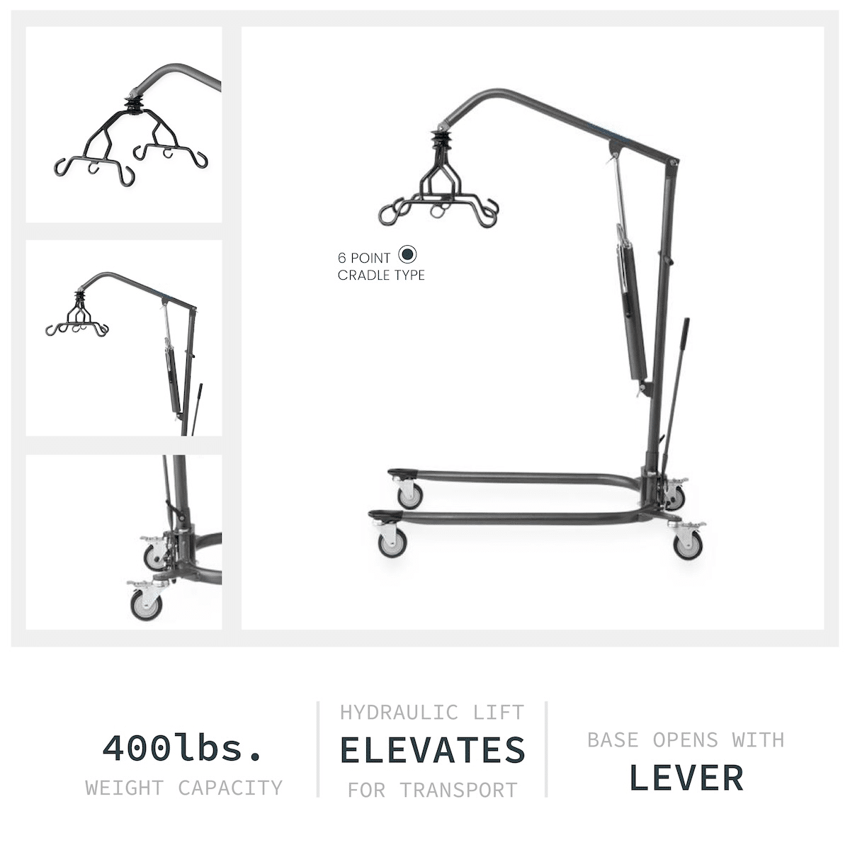 The Manual Hydraulic Patient Lift provides a safe and reliable solution for patient transfers. Featuring a 6-point cradle, a 400 lb weight capacity, and a durable hydraulic system, this lift ensures smooth, secure lifting—including from the floor. The base easily opens with a hand lever for stability during transfers, while the included full-body sling adds comfort and support. Designed for convenience, the lift assembles quickly without tools using D-ring pins.