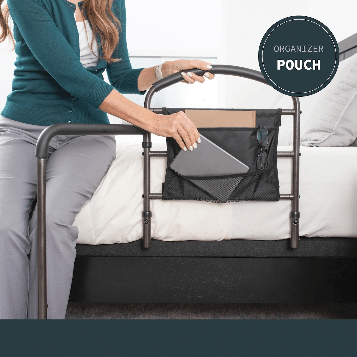 Request This ProductThe Mobility Rail provides dependable bedside support with a padded handle and a unique swing-out arm for extra stability when standing or sitting. Its 180° pivoting bar offers flexible assistance, while the included organizer pouch keeps essentials close at hand. With a secure safety strap attachment, this rail delivers comfort, safety, and convenience for everyday use.
