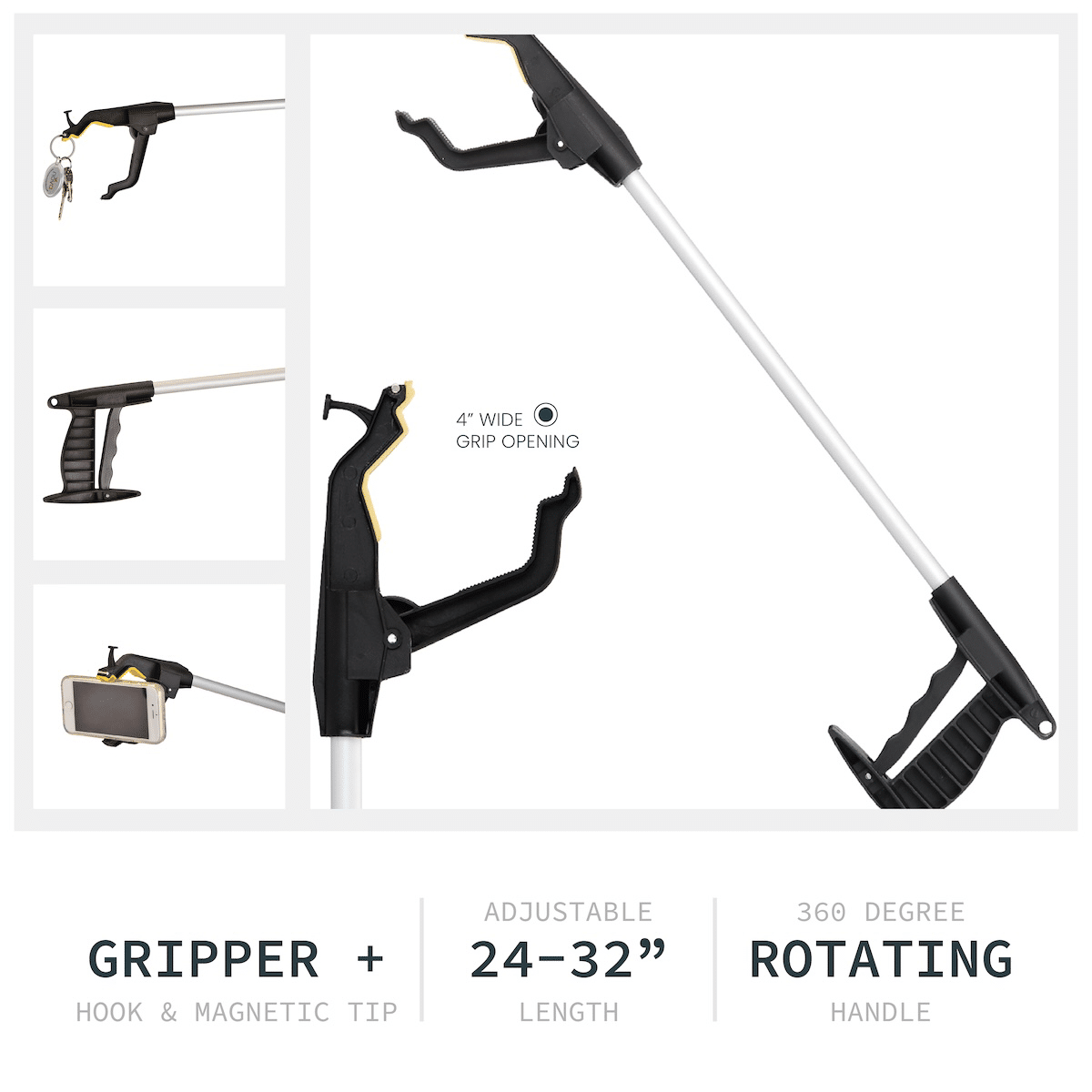 32” length retrieves items from high shelves or the floor.Rotating Jaw