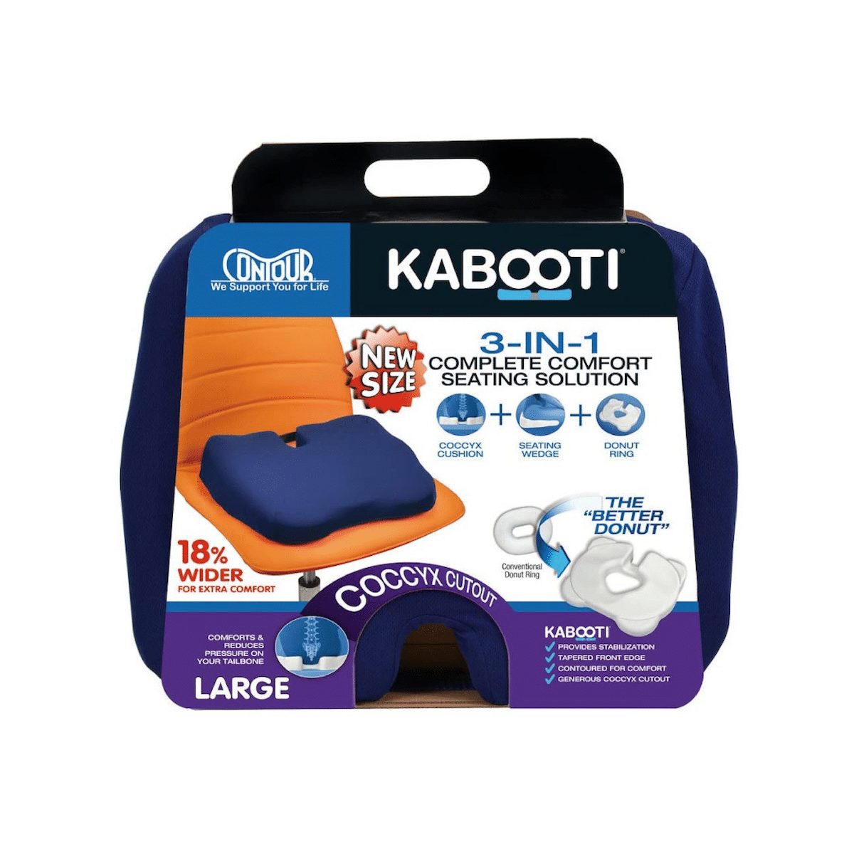 The Contour Kabooti® Seat Cushion is the ultimate all-in-one seating solution, designed to relieve pressure and provide comfort for those experiencing coccyx pain, tailbone injuries, hemorrhoids, postpartum discomfort, perineal wounds, post-surgical pain, or general lower back pain. With a generous coccyx cutout, contoured ergonomic design, and tapered wedge shape, the Kabooti encourages proper posture while reducing pressure on sensitive areas. Its stability bridge and corner lobes provide improved balance and durability, while the sculpted surface promotes airflow for cooling comfort. Lightweight and portable with a built-in carry handle, the Kabooti is perfect for use at home, in the office, or on the go.