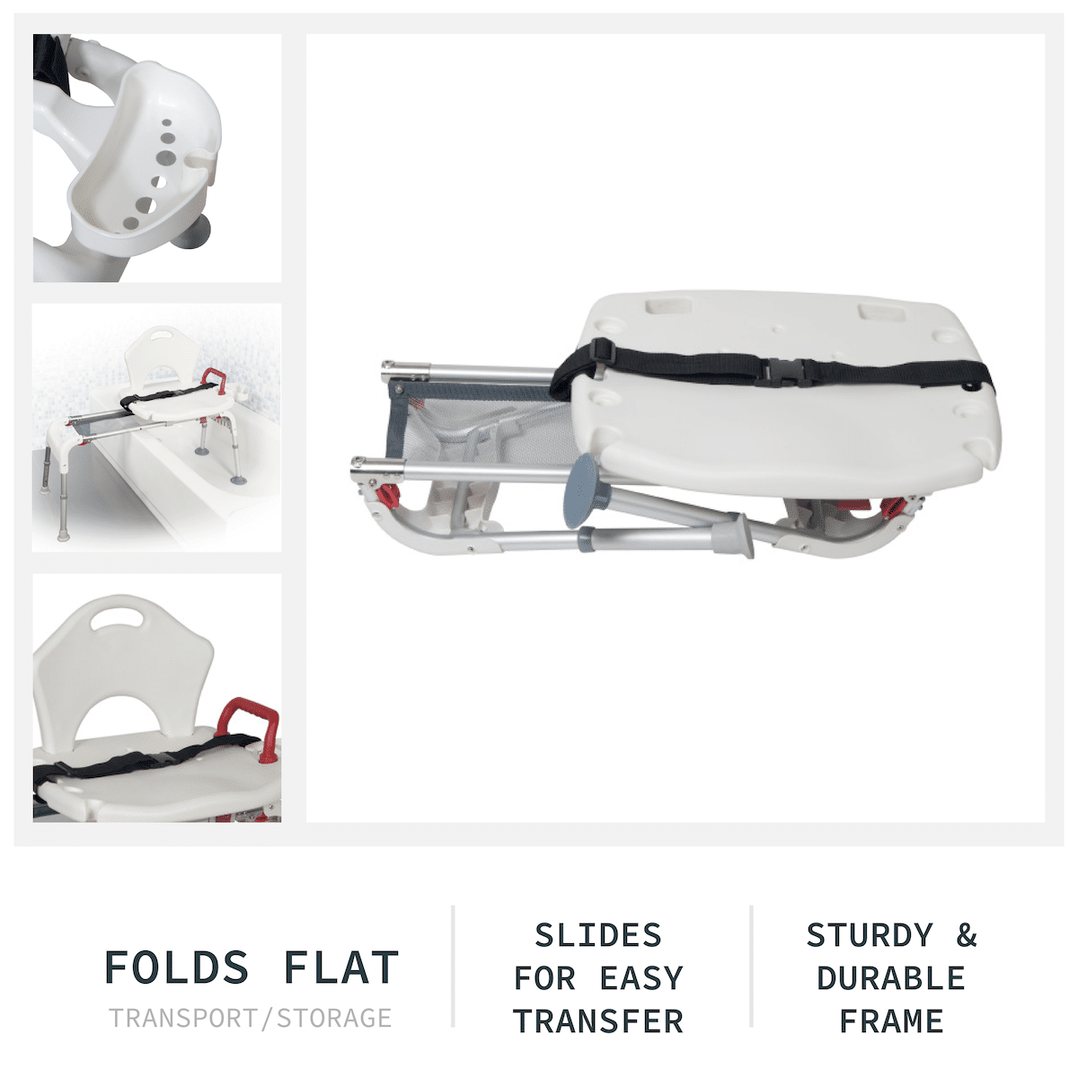 - Slip-resistant suction cup feet for secure stability in the tub - Reversible backrest installs easily without tools - Side arm offers added leverage and security during transfers - Pushbutton height adjustment for a customized fit - Bariatric design supports up to 400 lbUse Case