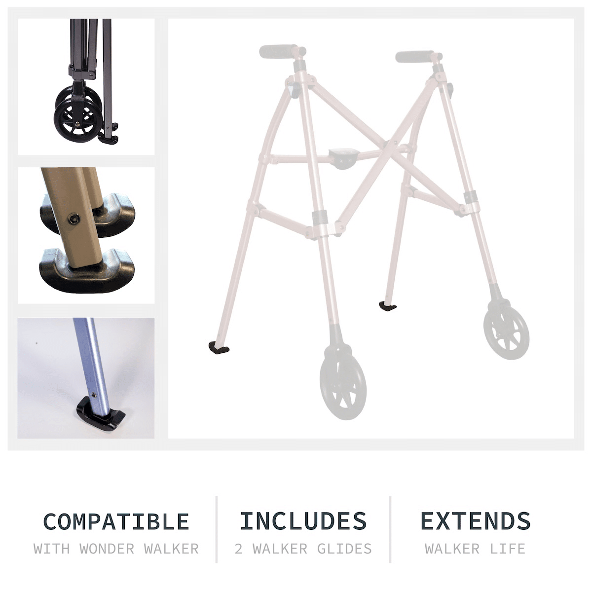 Request This ProductThe Walker Replacement Glides keep your walker moving smoothly on indoor and outdoor surfaces. Made from durable plastic, these glides are easy to install and extend the life of your walker by replacing worn tips. Designed for a secure fit, they’re compatible with Stander Wonder Walkers, Wonder Walker Plus, and Elite Travel Walkers.